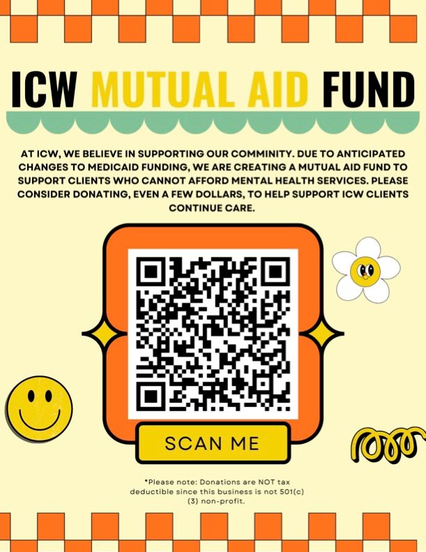 In anticipation of folx losing access to insurance, and in alignment with ICW's core values, we have launched the ICW Mutual Aid Fund. Using the platform of Venmo, we are collecting financial resources to support clients who might not be able to afford mental health services. Donating to the mutual aid fund supports those who may lose insurance, as well as those experiencing unexpected life changes that impact finances. Through the mutual aid fund, we hope to provide a soft cushion for folx and to help cover financial lapses that may occur.